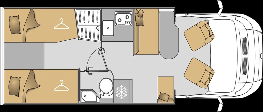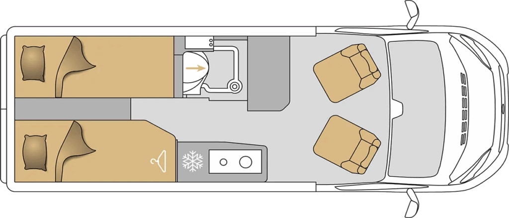 Beim Mooveo VAN-60 EB handelt es sich um einen Camper VAN mit Einzelbetten auf Lattenrost und Bultex-Matratzen. Diese können nach Belieben zu einer großen Liegefläche erweitert werden und bieten Platz für 2 Personen. Im großzügig angelegten Wohnraum können sich dank der ausgeklügelten Bauweise 2 Personen gleichzeitig aufhalten. Der Wohnzimmertisch ist ausklappbar und kann auch zum Verweilen im Freien genutzt werden. Sie genießen ein Raumbad mit ausklappbarem Waschbecken. Hier haben Sie ebenso ausreichend Platz zum Duschen.